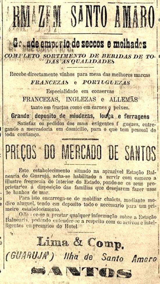 Armazém Santo Amaro, de Lima & Comp., em Santos, e a Estação Balneária de Guarujá Publicado no jornal Diário de Santos, em 8 de janeiro de 1904, página 3 Imagem: Hemeroteca da Biblioteca Nacional - Rio de Janeiro/RJ
