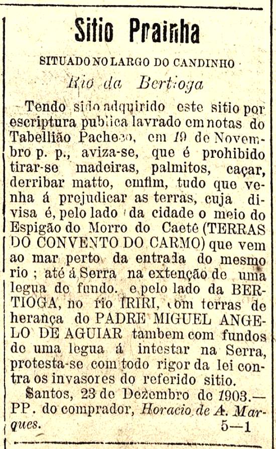 Sítio Prainha, no rio Iriri em Bertioga, foi comprado por Horacio de A. Marques ao Convento do Carmo/herança do padre Miguel Angelo de Aguiar Publicado no jornal Diário de Santos, em 8 de janeiro de 1904, página 3 Imagem: Hemeroteca da Biblioteca Nacional - Rio de Janeiro/RJ