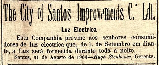 The City of Santos Improvements Co. avisa aos consumidores que a partir desse dia a eletricidade será também fornecida em todo o período noturno Publicado no jornal Diário de Santos, em 1º de setembro de 1904, página 3 Imagem: Hemeroteca da Biblioteca Nacional - Rio de Janeiro/RJ