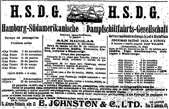 E. Johnston & Comp., agentes Hamburg Sudamerikanishe Dampfschfffahrts Gesellschaft (HSDG) Publicado no jornal O Estado de São Paulo em 11 de outubro de 1910, página 10 (Acervo Estadão)