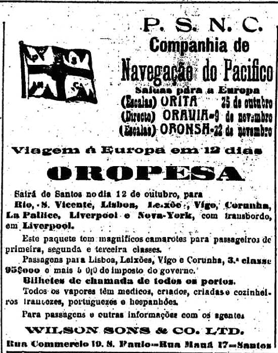 Wilson Sons & Co. Ltd. - agentes da Companhia de Navegação do Pacífico (P.S.N.C.) Publicado no jornal O Estado de São Paulo em 11 de outubro de 1910, página 10 (Acervo Estadão)