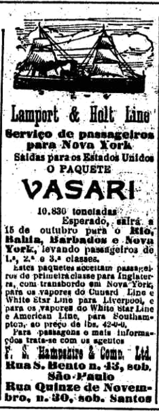 F. S. Hampshire & Comp. Ltd. - agentes da armadora inglesa Lamport & Holt Line Publicado no jornal O Estado de São Paulo em 11 de outubro de 1910, página 10 (Acervo Estadão)