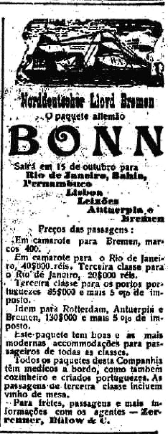 Zerrenner, Bülow & C. - agentes da armadora alemã Norddeutscher Lloyd Bremen Publicado no jornal O Estado de São Paulo em 11 de outubro de 1910, página 10 (Acervo Estadão)