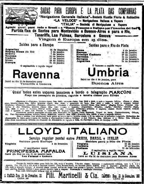 Fratelli Martinelli & Cia. - agentes das armadoras italianas Navigazione Generale Italiana - Societá Riunite Fiorie & Rubbatino, La Veloce Navigazione Italiana a Vapore, Italia Societá di Navigazione a Vapore e Lloyd Italiano Publicado no jornal O Estado de São Paulo em 18 de dezembro de 1910, pág. 8 (Acervo Estadão)