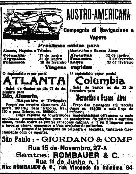 Rombauer & C., agentes em Santos da Austro-Americana Compagnia di Navigazione a Vapore Publicado no jornal O Estado de São Paulo em 18 de dezembro de 1910, pág. 8 (Acervo Estadão)