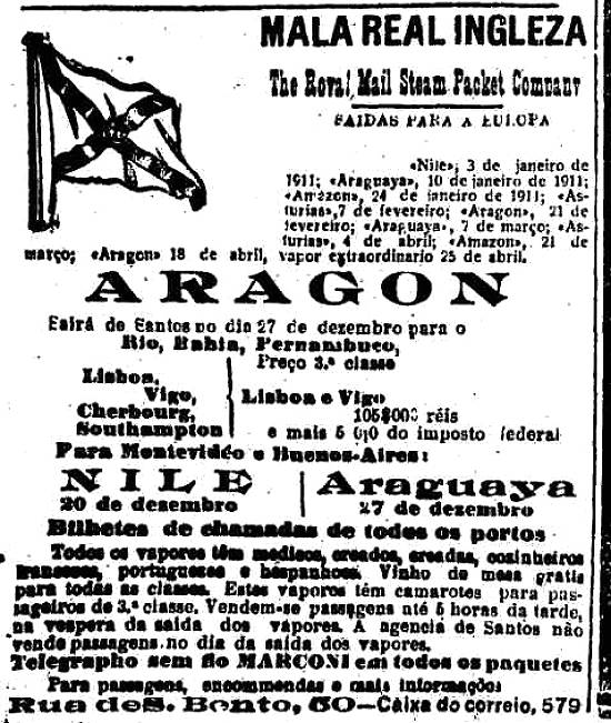 Mala Real Ingleza - The Royal Mail Steam Packet Company - navios saídos de Santos para Europa Publicado no jornal O Estado de São Paulo em 18 de dezembro de 1910, pág. 8 (Acervo Estadão)
