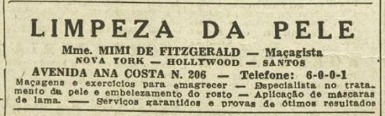 Limpeza da pele, por madame Mimi de Fitzgerald, massagista, na Avenida Ana Costa, 206 "Nova York - Hollywood - Santos"