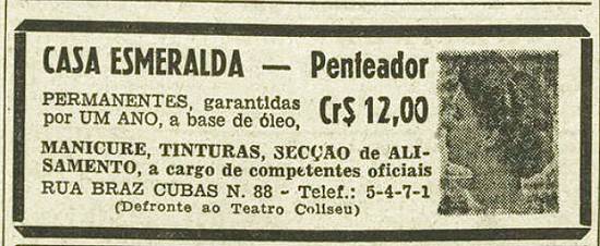 Casa Esmeralda - penteador - "PERMANENTES, garantidas por UM ANO, à base de óleo" - "Manicure, tinturas, seção de alisamento, a cargo de competentes officiais - Rua Braz Cubas, 88 (defronte ao Teatro Coliseu)"
