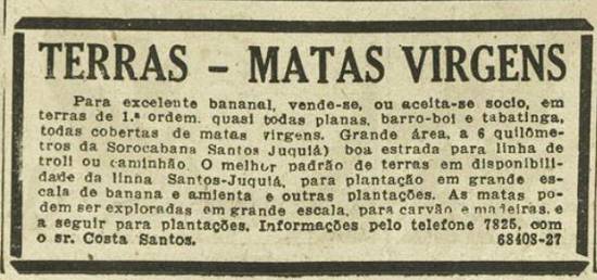 Terras - matas virgens - para bananal, a 6 km da ferrovia Sorocabana Santos-Juquiá. "As matas podem ser exploradas em grande escala, para carvão e madeiras e a seguir para plantações"
