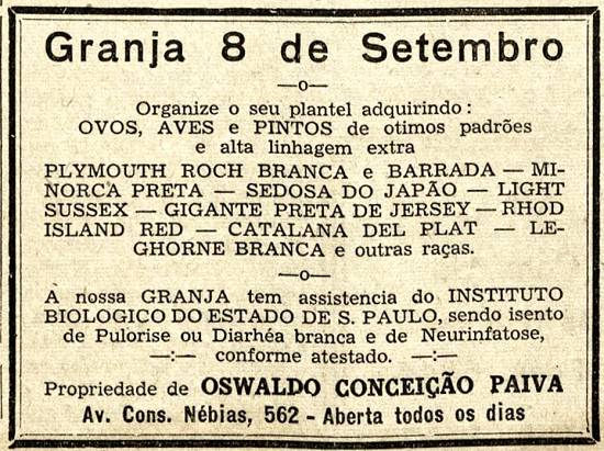 Granja 8 de Setembro, de Oswaldo Conceição Paiva, na Av. Conselheiro Nébias, 562: ovos, aves e pintos de alta linhagem extra - Plymouth Roch Branca e Barrada; Minorca Preta; Sedosa do Japão; Light Sussex; Gigante Preta de Jersey; Rhod Island Red; Catalana del Plat; Leghorne Branca e outras raças -, com assistência do Instituto Biológico do Estado de São Paulo, isentos de diversas doenças