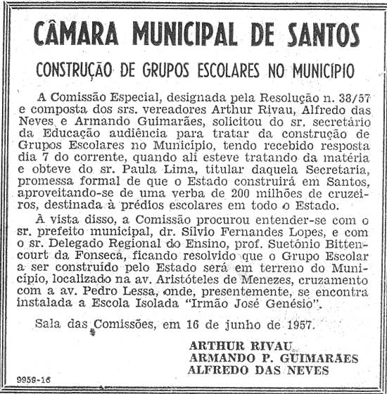 Publicado no jornal santista O Diário, em 16 de junho de 1957, seção 1ª, página 5