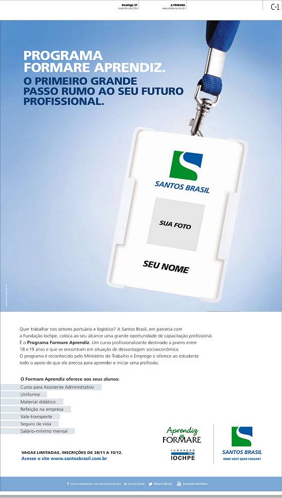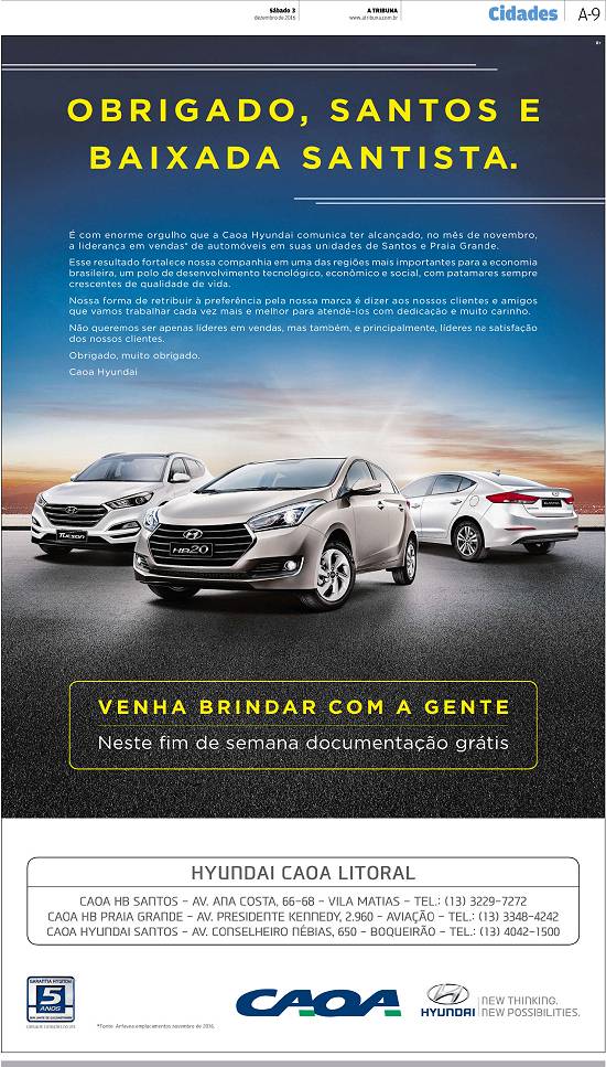 Anúncio publicado no jornal santista A Tribuna em 23 de novembro de 2016, pág. A-7