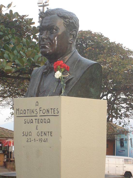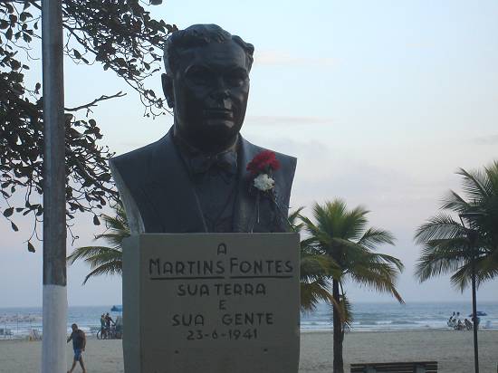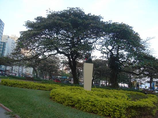 no jardim da praia, existe o busto do poeta Martins Fontes (as flores são naturais, colocadas por algum admirador):