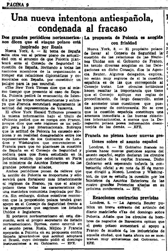 se rompa com Franco, porque diz que este regime é um perigo para a paz internacional". Salienta que a atitude de Polônia causou surpresa e em
