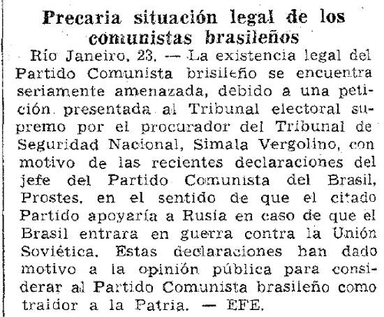 caso o Brasil entre em guerra contra a União Soviética. Estas declarações deram motivo à opinião pública para considerar o Partido Comunista