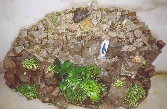 Gruta de Nossa Senhora de Lourdes, no térreo, e um sino instalado no andar superior