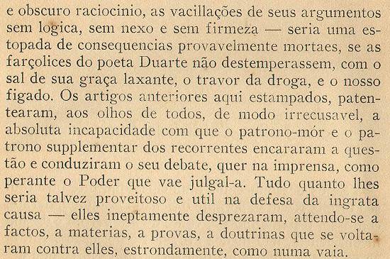 seus argumentos sem lógica, sem nexo e sem firmeza - seria uma estopada de conseqüências provavelmente mortais, se as farçolices do poeta Duarte