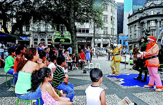 Palhaços, da Trupe Olho da Rua atraiu a atenção das pessoas que passavam pela Praça Mauá, no início da tarde de ontem. De forma bem-humorada, a montagem satiriza o Natal, com cinco palhaços, malabarismos e pirofagia, além de versões de