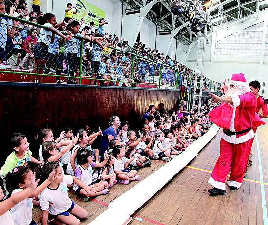 Cerca de 880 crianças de 22 entidades cadastradas participaram da festa de Natal promovida pelo FSS (Fundo Social de Solidariedade), lotando ontem o ginásio do Clube Internacional de Regatas, na Ponta da Praia. O ponto alto da festividade foi a presença de Papai Noel e suas ajudantes, que distribuíram presentes às crianças. Antes, o grupo Interfolias, do Inter, entusiasmou a plateia infantil com um espetáculo de patinação. As coreografias, com graça e beleza das patinadoras, prestavam homenagem ao Brasil e países europeus.