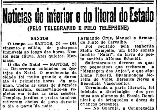 Foi recitado, pela senhorita Stella Campello, um belo soneto inédito Natal, da lavra do poeta santista Affonso Schmidt.