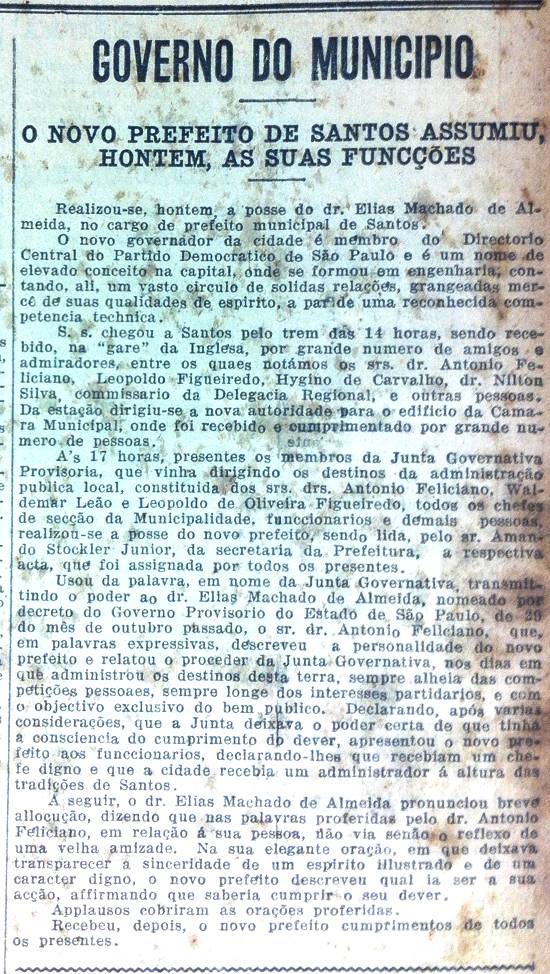 Realizou-se, ontem, a posse do dr. Elias Machado de Almeida, no cargo de prefeito municipal de Santos.