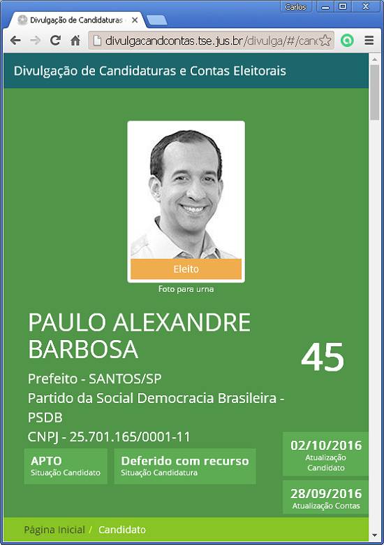 Página do candidato no site do Tribunal Superior Eleitoral (acesso: 9/10/2016)