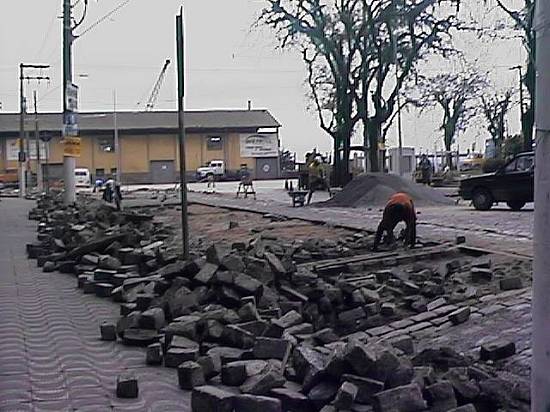 O circuito do bonde turístico (parcialmente visto nestas imagens captadas no dia 19/9/2000) ainda estava sendo completado, quatro dias antes da inauguração da linha, com os calceteiros trabalhando noite e dia para cumprir o prazo previsto.