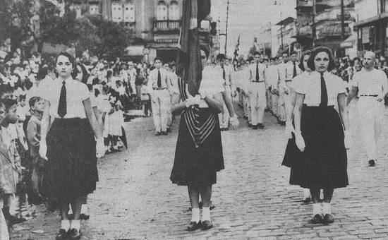 Independência, em 7 de setembro de 1953, desfila a primeira turma do curso Normal da Escola Martim Afonso. À esquerda, no canto do prédio, ficava o